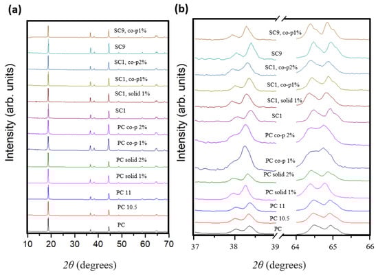 Normalized XRD patterns for every sample analyzed in this study. (a) Full XRD scan (10–70°) and (b) focused scan highlighting the [006]/[102] and [108]/[110] planes (37–39° and 64–66°).