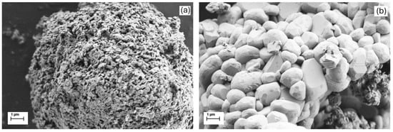 The SEM analysis (Figure 2) further reveals the different morphologies of the NMC cathodes synthesized by following two different synthesis strategies (PC or SC). Regardless of the synthesis method, the samples show predominantly irregular agglomerations of primary particles that coalesce to form secondary particles in the 3 to 10 µm range. However, there are clear differences between the SC and PC methods. The SC method, which is characterized by higher calcination temperatures, leads to larger primary particles (0.5 to 3 µm), in contrast to the smaller primary particles (0.1 to 0.5 µm) observed in PC samples (Figure 2). The two representative samples shown in Figure 2 also demonstrate that the PC sample displays a highly porous, sponge-like morphology (Figure 2a) while the SC1 sample exhibits well-defined, dense polyhedral particles ranging from 1 to 3 μm in size (Figure 2b). More details about the differences in the microstructure between materials are provided in the Supplementary File (Figure S2).
