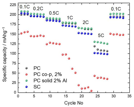 Galvanostatic cycling tests at various C-rates and controlled potential limits evaluated the electrochemical properties of all samples.The electrochemical properties of all samples were evaluated by a series of galvanostatic cycling tests conducted under controlled potential limits and different C-rates. Care was taken to ensure that the conditions for electrode preparation, electrode loading, electrolyte quantity, cell assembly, and electrochemical testing remained the same. These tests aimed to determine the differences between the parameters varied in this study. In this work, we present only four representative samples, i.e., apolycrystalline sample (PC), a single-crystalline sample (SC1), and two doped polycrystalline samples prepared with a different strategy of doping (PC solid 2% and PC co-p 2%).