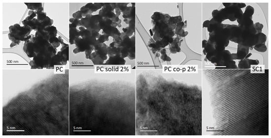 To investigate the structure at the microscopic level and their behavior regarding electrical characteristics after synthesis, selected samples were analyzed by TEM: PC, PC solid 2%, PC co-p 2%, and SC1, which were chosen based on their electrochemical performance (as indicated in Figure 3). The analysis employed both bright-field STEM and high-resolution imaging and provided significant insight into the crystallinity, particle size distribution, and electronic structure of these samples.