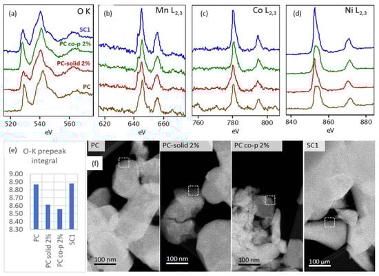 STEM-EEL spectra of the (a) O K edge, (b) Mn L2,3, (c) Co L2,3, and (d) Ni L2,3 edges taken from the edges of PC (brown), PC-solid 2% (red), PC co-p 2% (green) and SC1 particles (blue) ca. 50 nm into particle. (e) O K edge pre-peak integral calculated for all four samples from the spectra acquired from areas marked in (f) STEM-HAADF images of samples.