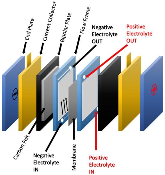 In practice, a flow battery system has a distinctive configuration (Figure 3). The structure of a typical RFB contains carbon felt or carbon plastic electrodes, bipolar plates usually made from graphite (these prevent direct contact between the electrolyte and current collectors), membranes (that may be an anionic exchange membrane, or a cationic exchange membrane) or a separator, a flow frame (to direct the electrolyte flow through the electrodes), and an end plate with electrolyte fittings and current collector. This is the working unit of an RFB and is separated from the bulk of the electrolyte. As such, it can be modified to suit the needs of the system independently from the electrolyte storage system [41]. For larger operations, the cells are stacked together.