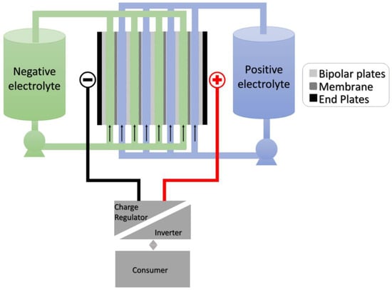 The flow is provided via a series of pumps which in turn are controlled by a central control system. The system is connected to the grid through an inverter [41], completing the integrated battery storage system (Figure 4).