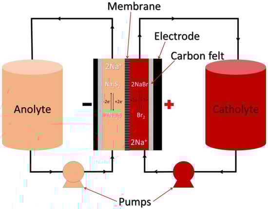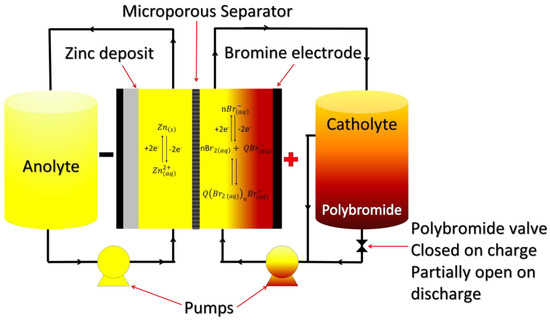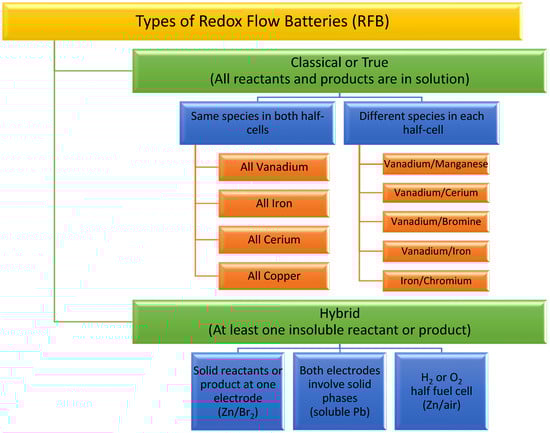 RFBs can be divided into classical or true RFBs and hybrid RFBs, which are further divided into Type I and Type II [42] (Figure 5). Classical RFBs use inert electrodes and redox species that remain in the solution. Examples of classical RFBs are the iron chromium (Fe/Cr) system [40], the bromine–polysulphide system [43,44], and the vanadium RFBs [45]. Hybrid RFB operation involves a phase change during the cell reaction. An example is the zinc/bromine system in which the plating and dissolution of zinc at the anode occur upon charge and discharge, respectively [46,47,48,49,50,51].