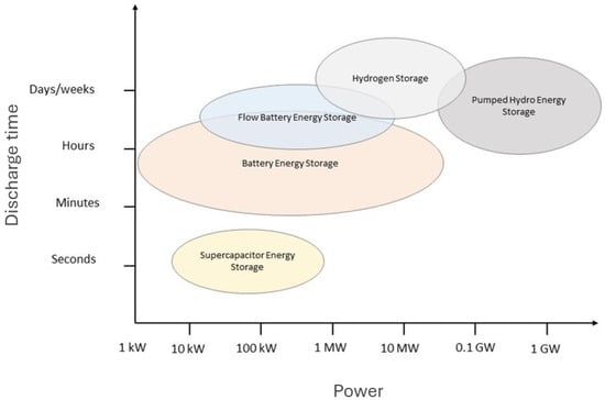 Diagram comparing power rating and discharge time of some energy storage systems (adapted from [54,55]).