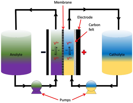 The electrochemical reactions occur on the inert carbon felt electrodes in the half-cells. Pipes and pumps are used to move the electrolyte from its storage tanks to the stack. As such, the correct pretreatment of these electrodes to ensure hydrophilicity and reduce faradaic resistance is important. The performance of a VRFB is not significantly degraded by repeated full discharge or charge rates as high as the maximum discharge rate, according to Skyllas-Kazacos and colleagues [105]. A schematic showing the reactions in a VRFB can be seen in Figure 7.