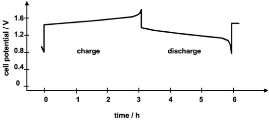 The standard cell potential is 1.26 V at 25 °C, but the practical single cell voltage is between 1.4 and 1.6 V for a 1.6 M vanadium ion solution with 4.6 M sulfuric acid. VRFB net efficiency can be as high as 85%. Like other flow batteries the power and energy ratings of VRFBs are independent of each other. A typical charge–discharge curve for the VRFB bipolar electrode is shown in Figure 8 for a battery with 80% voltaic efficiency (VE) and 91% Coulombic efficiency (CE) [107]. The water (H2O) and protons (H+) are required in the positive reaction to maintain the charge balance and the stoichiometry [3].