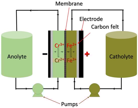 Despite these advantages, several disadvantages accompany the implementation of ICRFBs. The permeation of all active species through the membrane can create substantial concentration gradients between the anode and cathode tanks, resulting in decreased performance and accelerated degradation of the electrolyte [159]. The mixed electrolyte also exhibits reduced solubility, which limits the overall capacity of the system. While the solubility of FeCl2 and CrCl3 can reach 2 M, the solubility in the mixed system is considerably lower, with optimal electrolyte concentrations reported at 1 M FeCl2, 1 M CrCl3, and 3 M HCl [174]. Additionally, the system operates within a narrow voltage range of 0.7–1.2 V, further constraining its capacity [174]. The standard potential of the Cr2+/Cr3+ couple is close to that of hydrogen evolution, which can trigger parasitic side reactions, diminishing capacity and exacerbating electrolyte imbalance [159]. Although some of these issues may be mitigated through rebalancing systems, such solutions increase both the cost and complexity of maintenance for the system. Figure 9 provides an overview of an ICRFB cell [166].