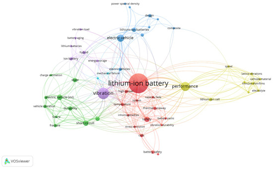 The network visualization in Figure 2 illustrates the relationships and clustering of research topics related to lithium-ion batteries. The central themes “lithium-ion battery”, “vibration”, and “performance” connect to subtopics such as “safety”, “EVs”, and “durability”. Each color represents a distinct cluster, showing how various concepts “temperature”, “mechanical shock”, and “battery packs” interlink across research areas. Current tests often fail to simulate the real-world effects on batteries’ thermal behavior and degradation conditions, where batteries experience combined thermal and vibrational stresses that can accelerate degradation, compromise performance, and impact safety.
