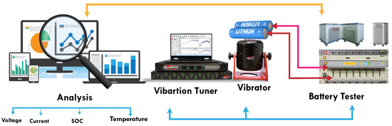 Despite their growing market share and importance, there is limited comprehensive knowledge regarding how vibrations impact Li-ion batteries’ mechanical integrity, safety, and electrical efficiency. Figure 3 depicts a traditional vibration testing method for batteries. It involves analyzing parameters such as voltage, current, state of charge (SOC), and temperature to monitor battery behavior. A vibration tuner sets and controls the vibration profile, which is applied to the battery using a vibrator. The battery tester evaluates the electrical and thermal responses of the battery under vibrations, such as capacity, resistance, and heating effects. The process includes a feedback loop where test data inform adjustments to improve accuracy and reliability.