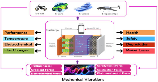 Vibrations refer to mechanical oscillations in systems due to dynamic forces, mechanical stress, or external excitations. In engineering systems, vibrations can arise from operational machinery, external environmental factors, or inherent material behavior [64]. Vibrations can significantly affect components’ thermal behavior and material properties in automotive systems, aerospace, and battery technology applications. Heat generation due to vibrations can be explained using principles from thermodynamics and mechanics [65]. The following equation represents the heat generated in a material due to damping (energy dissipation) caused by vibrations: