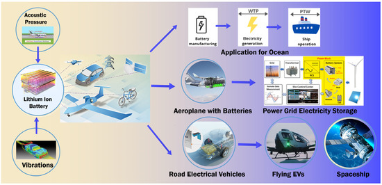 Figure 6 [36] highlights the importance of vibration studies and acoustic pressure in enhancing the performance of lithium-ion batteries for ships, airplanes, electric vehicles (EVs), and flying cars. Vibrations and noise can negatively affect battery performance, causing degradation or failure. Structural battery composites, which combine energy storage with structural support, must withstand these stresses. Vibration studies help to create batteries that endure mechanical forces and acoustic pressures in harsh environments. This research ensures that batteries are durable, efficient, and safe for ships, airplanes, and EVs. In flying electric vehicles, these studies are crucial for ensuring battery reliability during flight and ground operations, improving performance and safety across all applications.