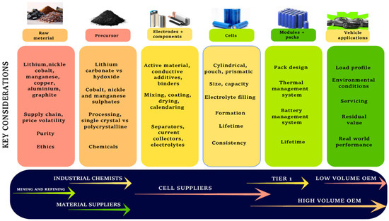 Figure 7 provides an overview of the key considerations in the lifecycle of lithium-ion batteries, from raw materials to vehicle applications. It highlights critical aspects such as material sourcing, processing, and ethics; the development of precursors; electrode and component manufacturing; and cell formation and consistency. One of the breakthroughs in recent battery modeling is the development of physics-based models that can predict degradation mechanisms over time. This includes simulating solid–electrolyte interphase (SEI) layer growth, lithium plating, and capacity fade [41]. Models identical to these are invaluable for understanding long-term battery health and optimizing battery management systems (BMSs) that prolong battery life by controlling operational conditions as charging rates and temperature [42].