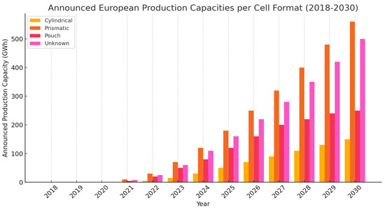 The bar graph in Figure 8 shows Europe’s projected battery cell production capacities by format (cylindrical, prismatic, pouch, and unknown) from 2018 to 2030, reflecting the growing demand for EVs and energy storage. Moreover, machine learning and artificial intelligence advancements have been integrated into battery modeling to enhance predictive capabilities further. By analyzing large datasets generated from battery usage, machine learning algorithms can identify patterns and predict battery performance and failure modes with greater accuracy [43]. Integrating data-driven approaches with traditional models represents a significant step in improving battery design and lifecycle management.