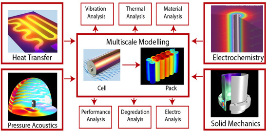 Recent advancements, as shown in Figure 9, in physics-based battery modeling have focused on integrating multiple domains, such as electrochemical, electromechanical, and electromagnetic physics, alongside AI-driven analytics to create highly accurate and predictive models. Electrochemical modeling captures charge transport and reaction kinetics, while electromechanical coupling accounts for stress and strain effects on battery components due to intercalation and thermal expansion. Electromagnetic analysis is used to study high-frequency effects and optimize current collection. This multidisciplinary approach offers enhanced insights into battery behavior, aiding in the design of safer, more efficient, and longer-lasting energy storage systems. Vibrational studies using COMSOL Multiphysics involve coupling mechanical, thermal, and electrochemical physics to analyze the effects of vibrations on battery performance and degradation. The process begins with a detailed geometry definition, including electrodes, separator, and casing, followed by assigning materials with properties such as Young’s modulus, thermal conductivity, and diffusivity, which may be temperature or stress dependent. The Solid Mechanics interface is used to model vibrational loads through harmonic forces or sinusoidal displacements, with modal analysis identifying natural frequencies to avoid resonance. The Heat Transfer interface is included to model heat generation from electrochemical reactions and mechanical friction, while cooling mechanisms such as convection are applied to mimic thermal management. Coupling is achieved using the Thermal Stress multiphysics interface for thermal–mechanical interactions and manual linking of stress fields to degradation parameters in the Electrochemistry interface, accounting for stress-enhanced SEI layer growth or lithium diffusivity change.