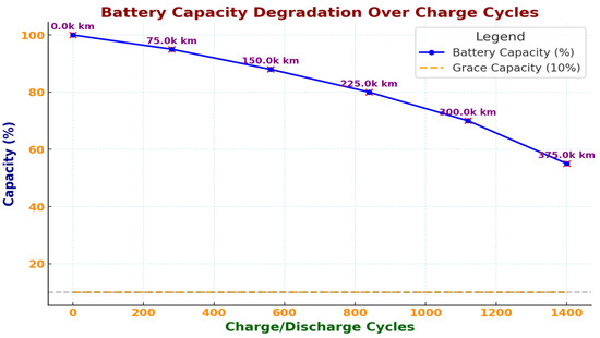 Although still in the research and development phase, solid-state technologies are expected to transform battery performance in the coming years. Figure 10 [57] shows how the driving range of a new battery is limited by reserving a grace capacity. After approximately 900 cycles, the upper grace capacity starts to be utilized. Software adjustments can extend the battery’s lifespan by adding more grace capacity, as depicted in the graph, but this comes at the cost of reducing the driving range. Battery safety remains a critical concern in developing Li-ion technology, mainly because of the risks associated with thermal runaway [58]. Lithium-ion batteries generate heat; this heat can degrade performance and shorten the battery’s lifespan if not effectively managed. Heat generation can be modeled as follows: