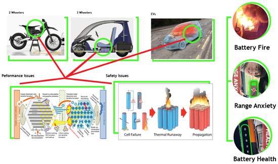 Lithium-ion (Li-ion) batteries have become the dominant energy storage technology in various applications, from consumer electronics, i.e., smartphones and laptops, to large-scale systems such as EVs and renewable energy storage [1]. Lithium-ion batteries have gained widespread popularity due to their numerous advantages, such as high energy density, long cycle life, low self-discharge rates, and minimal maintenance needs compared to rechargeable batteries such as nickel-cadmium or lead-acid. With the growing demand for clean energy solutions, these batteries have become essential in revolutionizing industries, especially transportation and power generation [2]. As the UK’s Net Zero goal aims to achieve zero carbon by 2050, so battery energy storage technology is pivotal in this effort. For instance, EVs are a key strategy to reduce greenhouse gas emissions, and efficient energy storage is essential to harness the full potential of renewable energy sources, including wind and solar [3,4]. However, the rapid adoption of Li-ion batteries also brings challenges related to their performance, safety, and durability, especially when subjected to harsh environmental conditions or mechanical and electrical stresses [5,6]. The discrepancy in Figure 1 arises because estimated battery life is often based on ideal conditions—consistent moderate temperatures, optimal charging practices, and regular maintenance. By contrast, actual battery life reflects the impact of factors such as extreme weather, frequent rapid charging, and variable driving styles, all of which can accelerate battery wear and reduce longevity.