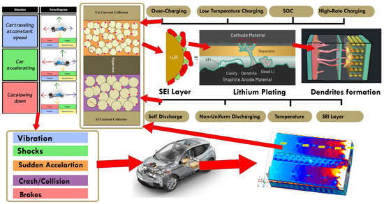 Li-ion batteries, especially in demanding applications such as EVs and aerospace, are often exposed to external mechanical and electrical abuses. Mechanical abuse can come in the form of vibrations, which may cause physical damage to battery components, such as electrode cracking or separator degradation. These effects can lead to internal short circuits, capacity loss, and safety hazards. Studies have shown that batteries subjected to repeated mechanical stresses can experience accelerated degradation, reducing their effective lifespan [71]. Electrical abuse, such as overcharging, over-discharging, or operating the battery outside its recommended voltage window, also harms battery life. Overcharging can lead to lithium plating on the anode, which reduces capacity and increases the risk of internal short circuits, while over-discharging can cause irreversible damage to the cathode material, making it difficult for the battery to regain its original capacity [73]. Addressing these issues requires the development of more resilient battery designs and improved management systems that can protect against these external stresses. By integrating advanced sensors and control algorithms, battery management systems can detect and mitigate mechanical and electrical abuses before they cause considerable damage.