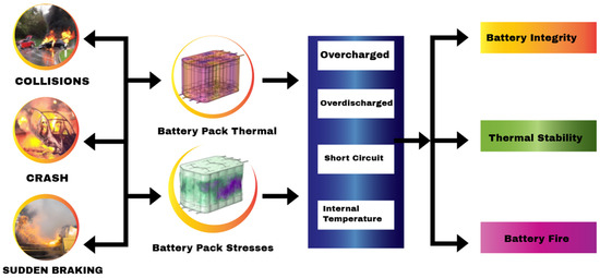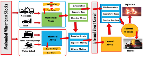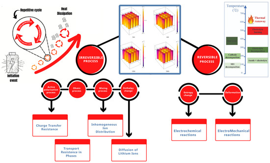 Thermal runaway is a self-propagating reaction when the battery’s internal temperature rises uncontrollably due to internal short circuits, overcharging, or external heat exposure [47]. This process can lead to battery fires or explosions if not managed effectively. Battery safety has always been a key concern in developing and deploying Li-ion batteries, mainly because of the risks associated with thermal runaway due to the internal chemical process, as shown in Figure 11.