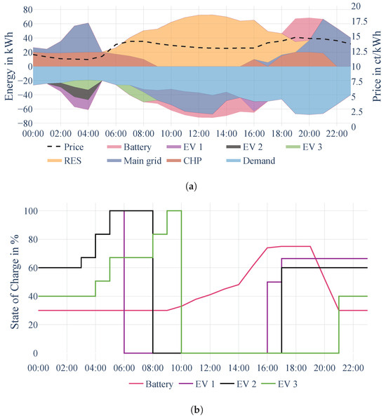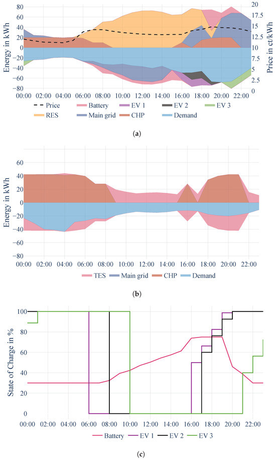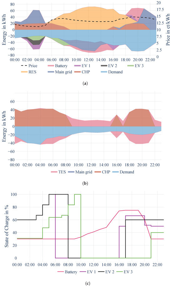 This study is conducted to assess the impact of different charging strategies for EVs on the operational energy costs while taking into account battery degradation. The method is applied to a neighborhood within an urban setting, representing a building complex in Pfreimd, Germany. It consists of four buildings with a total of 80 apartments and approximately 300 residents. The complex has its own energy resources and connections to the main energy grids for power, heat, and natural gas. The buildings are outfitted with PV modules. One of the buildings features a small-scale CHP, a TES, and a stationary battery. External electricity and district heating grids both supply energy to this community, and surplus electricity can be fed back into the grid; however, heat cannot. In this analysis, we account for battery degradation in both the stationary battery and the EVs batteries with the representations developed in [