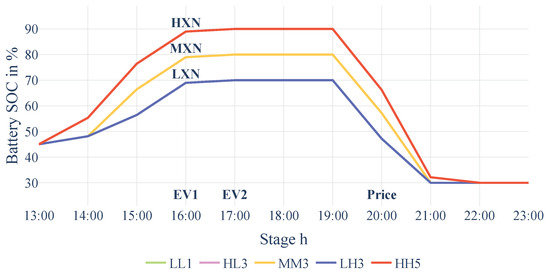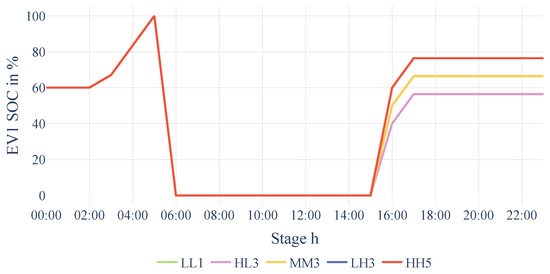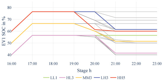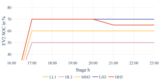 30], a battery and a spot market for electricity are the two considered elements. The multi-stage operational model in the current paper considers a system with many more elements, and it provides a comprehensive framework for accommodating uncertainty in EV owners’ behavior (charging demand) and electricity prices.