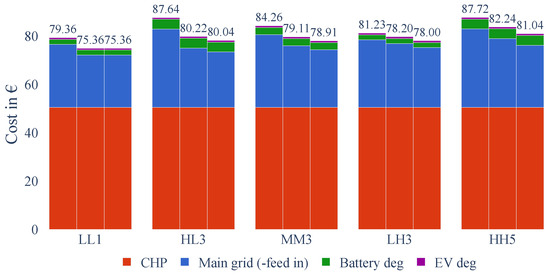 Battery degradation is up to of total costs in some scenarios, which is substantial, and highlights the importance of accurately trading off degradation costs and grid electricity price variations. Accounting for degradation affects the timing of charges and discharges, not only considering price variations, but weighing them against degradation costs, thereby inducing a slight preference for charging later and (dis) charging less aggressively.