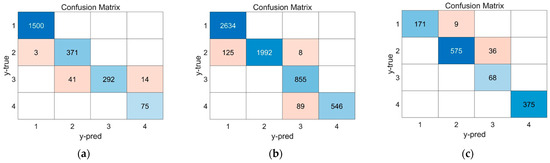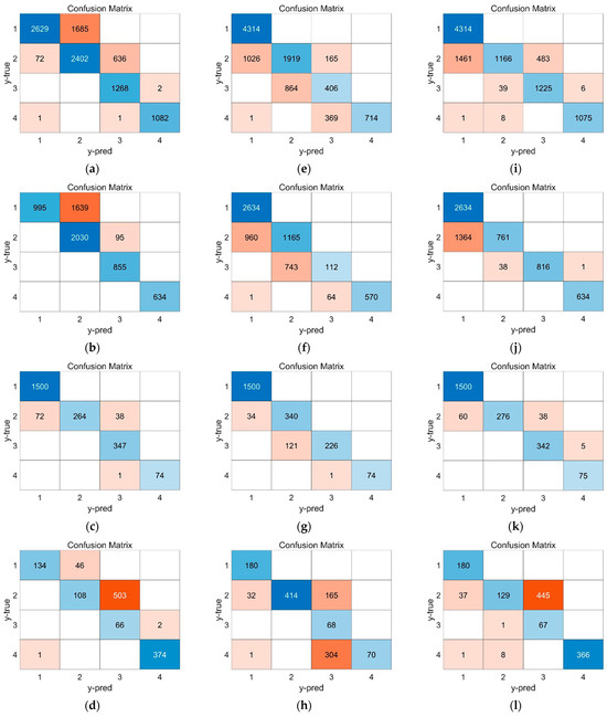 - After training the LSTM model, evaluate the network’s classification performance using a confusion matrix. The confusion matrix provides a quantitative comparison of actual class labels () and predicted class labels () for the test dataset. It is structured in Equation (10).