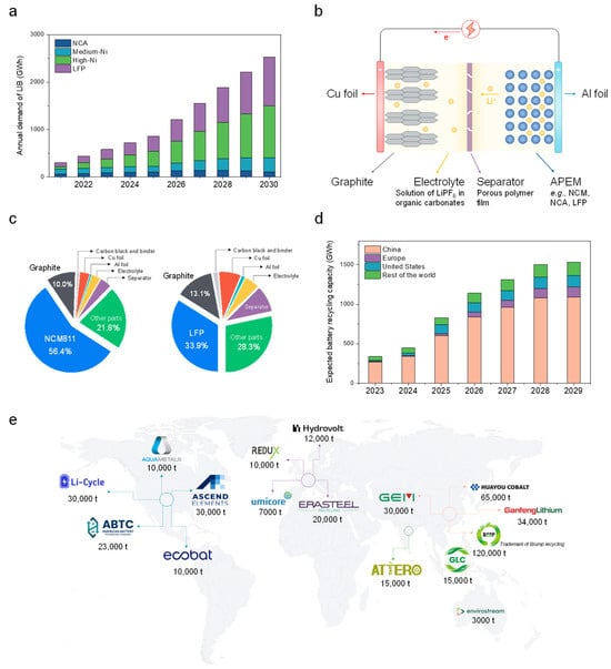 Figure 1b schematically shows the inner structure of a typical LIB cell. Among the components, active positive electrode materials (APEMs), currently dominated by LiFePO4 (LFP) and Li[NixCoy(Mn or Al)1−x−y]O2 (NCM or NCA), are determinative to battery performance and cost [3,4]. In particular, for EV battery systems using LiNi0.8Co0.1Mn0.1O2 (NCM811), APEMs account for 56.4% of the total material cost [5]. Even in LFP batteries, the spending on APEMs still represents the largest share of 33.9% (Figure 1c). The value of APEMs originates from their chemical compositions, where the typical constituent elements such as lithium, cobalt, and nickel have high levels of economic importance and supply risks [6]. Therefore, effective recycling/reusing strategies are attracting global attention to create circular supply chains and mitigate critical mineral demand. According to the International Energy Agency, the global recycling capacity exceeded over 300 GWh in 2023 and is projected to reach over 1500 GWh in 2030 [7]. A wide range of stakeholders, including specialized recycling firms, major battery manufacturers, chemical conglomerates, and mining corporations, are joining this competition, making substantial investments in R&D as well as establishing large-scale processing plants. One of the leading LIB recyclers is Brunp Recycling Technology Co., Ltd., a subsidiary of the world’s largest battery manufacturer, CATL, based in China. Brunp operates pyrometallurgical facilities with an annual recycling capacity of 120,000 metric tons. European and American companies are also increasing their efforts in LIB recycling. For example, a modern EV battery recycling plant operated by Hydrovolt in Norway currently treats approximately 12,000 tons of battery packs per year and plans to expand the capacity to 300,000 tons by 2030. In North America, Ascend Elements has the capability to process 30,000 tons of end-of-life LIBs and scrap annually. Figure 1e shows some representative recyclers with their processing capacities.