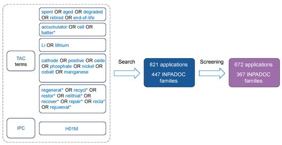 The study sourced patents from the PatSnap platform, a comprehensive repository containing over 180 million patents across 170 jurisdictions. As shown in Figure 2, the screening process involved a series of Topic/Abstract/Content (TAC) items: (spent OR aged OR degraded OR retired OR end-of-life) AND (cell OR batter* OR accumulator) AND (Li OR lithium) AND (cathode OR positive OR oxide OR phosphate OR nickel OR cobalt OR manganese) AND (regenerat* OR recycl* OR restor* OR relithiat* OR recover* OR repair* OR recla* OR rejuvenat*). The truncation symbol (*) was used to retrieve alternate word endings. Additionally, the IPC code H01M was included to narrow the search results. The search resulted in 821 records up to the date of 20 September 2024. As patent applications are often filed in more than one patent office, these filings can be grouped into patent families. Here, International Patent Documentation (INPADOC) defined by the European Patent Office (EPO) was used to group the inventions. The 821 records were associated with 447 INPADOC families. Then, the patents were screened individually to remove the unrelated documents, leaving 672 patent applications (367 INPADOC families).