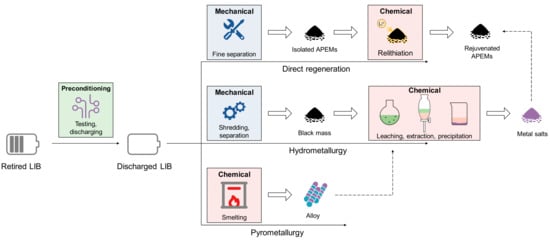 - Wang, J.; Ma, J.; Zhuang, Z.; Liang, Z.; Jia, K.; Ji, G.; Zhou, G.; Cheng, H.-M. Toward Direct Regeneration of Spent Lithium-Ion Batteries: A Next-Generation Recycling Method. Chem. Rev. 2024, 124, 2839–2887. [Google Scholar] [CrossRef]