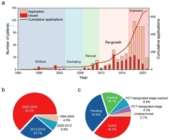 (a) Trend in patent filing and approval relating to APEM recycling for LIBs. (b) Distribution of applications across various time periods. (c) Simplified legal status of inventions.