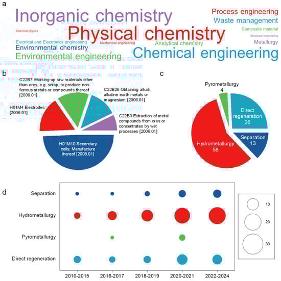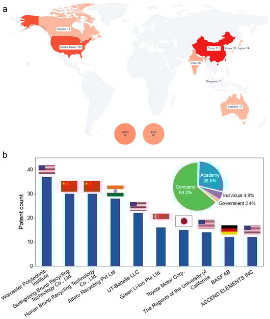 Generally, the reclamation of the valuable APEMs from waste LIBs is divided into three routes: pyrometallurgy, hydrometallurgy, and direct regeneration. Extensive research efforts have been made to improve the recycling efficiency and feasibility, the research progress of which have been thoroughly reviewed [8,9,10,11,12,13,14,15,16,17,18,19]. However, apart from the literature results, strong engagement of the industry is better reflected by patents, which have been rarely evaluated. Patents represent commercially viable and technically feasible solutions that companies and institutions deem promising [20,21,22,23,24]. In the context of high commercial interest in LIB recycling, patent analysis can offer a valuable tool for the understanding of the technological landscape. Examining patent filings not only helps to identify innovative methods/processes and emerging trends for improved recycling efficiency, reduced costs, and enhanced quality of regenerated APEMs, but also reveals areas of intense competition, potential technological bottlenecks, and opportunities for collaboration or licensing.
