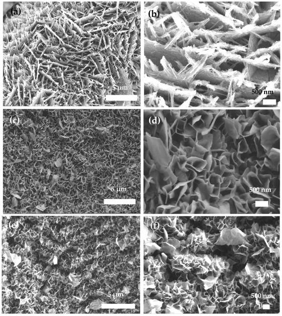 The morphology of the prepared samples is illustrated in Figure 2. It can be seen that the nanosheets evenly cover the whole surface of the Ni foam (Figure 2a). From the high-magnification SEM image in Figure 2b, it can be seen that the thickness of the CoNi2S4 product is approximately 20 nm, and nanowires grow uniformly at the edges of the nanosheets. This means that the sample has a larger specific surface area compared to pure sheets. Figure 2c,d show the uniform morphology of Ni(OH)2 directly grown on Ni foam. The average thickness of its nanosheets is around 10 nm. Figure 2e,f show how the Ni(OH)2 nanosheets are uniformly attached to the surface of the CoNi2S4 material. The CoNi2S4@ Ni(OH)2 nanosheets reinforce the electrode structure and exhibit a large specific surface area, suggesting excellent electrochemical performance.