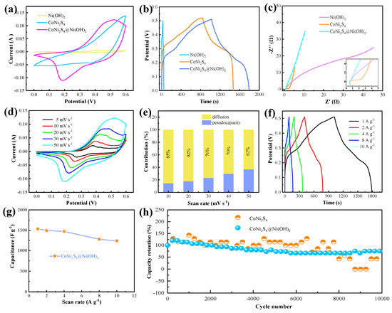 Electrochemical performance: (a) CV curves of prepared samples at scan rate of 50 mV/s. (b) GCD curves of prepared samples at 1 A g−1. (c) Nyquist plots of prepared samples. (d) CV curves at different scan rates. (e) Contribution ratio. (f) GCD curves at different current densities. (g) Capacitance at different scan rates. (h) Cycling performance.