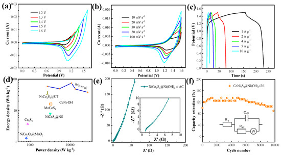 To explore the applicability of the CoNi2S4@Ni(OH)2 electrode material, a device was assembled. As shown in Figure 4a, the shape of the curves remains largely unchanged when the operating voltage varies from 1.2 to 1.6 V. This indicates that the device functions normally. Meanwhile, the shape of the curve remains largely unchanged when the scan rate varies between 10 and 100 mV s−1 (Figure 4b). This suggests that the material possesses a low polarization rate and excellent electrochemical performance [32,33].