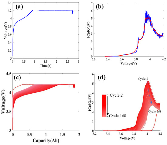 This section selects a complete charging process of Cell #05, as shown in Figure 1a. A complete charging cycle includes a constant-current stage and a constant-voltage stage. The blue curve in Figure 1b is generated by calculating dQ/dV, but there is a lot of noise. We selected the Kalman filter with parameters of = 25 s, Q = 0.005%, and R = 0.000001% to process the original blue curve to obtain the red curve, where the noise is eliminated. Then, 168 cycles of charging voltage data for Cell #05 were extracted, and its IC curves were constructed using the same parameters, as shown in Figure 1c,d, respectively. With the continuous cycle experiment of the lithium-ion battery, the internal active material of the battery is gradually lost, leading to its capacity to decay continuously, the total charging time of the battery is gradually shortened, and the charging voltage curve shifts to the left, as shown in Figure 1c. For the IC curves, with the increase in the number of cycles, the IC curve gradually shrinks downwards.