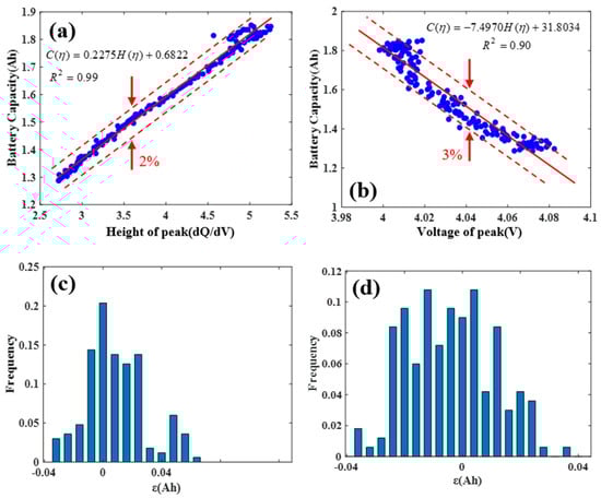 To further verify the correlation accurately, we quantify the correlation. In this paper, the least squares algorithm is used to fit the peak height and peak position of the IC curve of Cell #05 with the capacity. Figure 2a,b give the calculation results of the correlation between the peak height and the peak position of the Cell # 05 IC curve and the capacity, respectively. It can be seen from Figure 2a that with the decrease in IC peak height, the battery capacity decreases. The peak height has a strong linear relationship with its capacity, (R2 = 0.99). The relative error is about 2%. The relationship between IC peak height and battery capacity is as follows: