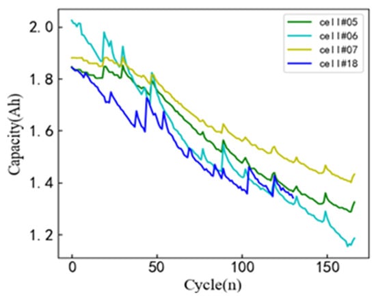 The aging data of lithium-ion batteries in this paper come from the battery aging dataset named Battery Aging ARC-FY08Q4 in NASA’s public dataset. Its lithium-ion battery numbers are Cell #05, Cell #06, Cell #07, and Cell #18 and comprise cycle aging data of batteries under normal conditions. The positive material of these batteries is LiNi0.8Co0.15Al0.05O2, and the negative electrode is graphite. The rated capacity is 2 Ah. The experimental temperature is 24 °C. The specific experimental steps are as follows: During the charging process, the lithium-ion battery is charged at a constant current of 1.5 A after the voltage rises to 4.2 V while keeping the voltage constant. Charging is continued and then stopped until the current drops to 20 mA. During discharge, the discharge current is 2 A. Four lithium-ion batteries are discharged to different cut-off voltages. Cell #05, Cell #06, Cell #07, and Cell #18 have discharge cut-off voltages of 2.7 V, 2.5 V, 2.2 V, and 2.5 V, respectively. One charging process and one discharging process constitute a complete cycle experiment.