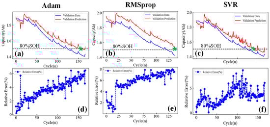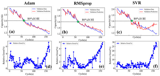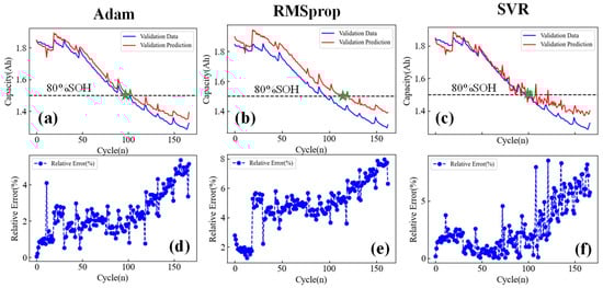 Capacity estimation results of Cell #06. (a–c) Capacity estimation results of the Adam, RMSprop, and SVR algorithms. (d–f) Capacity estimation errors of the Adam, RMSprop, and SVR algorithms.