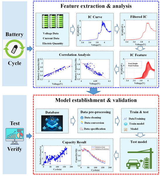 The capacity of lithium-ion batteries can be evaluated by charge, internal resistance, cycle number, and peak power. Currently, the most commonly used estimation methods for battery life can be divided into two categories (model-based and data-driven methods), which have been extensively reviewed [8,9,10]. From the perspective of the battery model, due to its simple structure, low computational complexity, and ease of development, the equivalent-circuit model (ECM) is commonly used to estimate capacity and has achieved good results. For example, Yu et al. [11] achieved online estimation of battery capacity based on a second-order equivalent circuit model and Kalman filtering (KF) algorithm. Moreover, Zheng et al. [12] constructed a semi-empirical estimation model for battery capacity based on the Arrhenius model and KF algorithm. These KF-based methods can estimate battery SOC and SOH, but they heavily rely on ECM. When the battery ages, the parameters of the battery model drift, leading to a decrease in model and capacity estimation accuracy. However, due to the inability of ECM to consider the electrochemical parameters related to the battery aging mechanism in the model, the adaptability of ECM is poor during the battery cycling aging process, and large amounts of test data need to be used for calibration or correction to ensure the accuracy of battery capacity estimation under actual vehicle operating conditions.