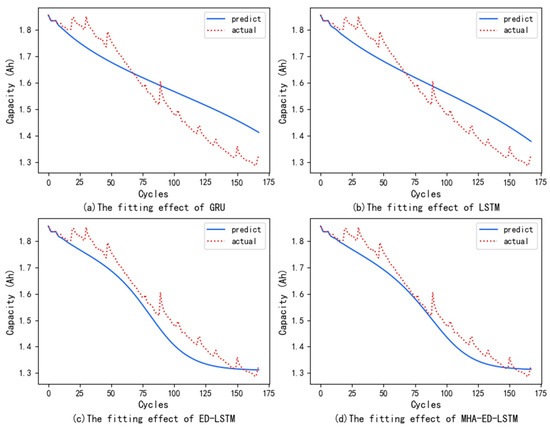 (a) The fitting effect of GRU; (b) The fitting effect of LSTM; (c) The fitting effect of ED-LSTM; (d) The fitting effect of MHA-ED-LSTM.