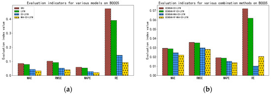 In general, the prediction accuracy of the CEEMDAN-RF-MHA-ED-LSTM method is relatively high; the prediction error indicators MAE and RMSE of the four groups of batteries are controlled at approximately 2% and 3%, respectively. To show the predictive ability of each model more intuitively, Figure 3 shows the evaluation metrics for each model on battery B0005.