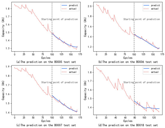 (a) The prediction on the B0005 test set; (b) The prediction on the B0006 test set; (c) The prediction on the B0007 test set; (d) The prediction on the B0018 test set.