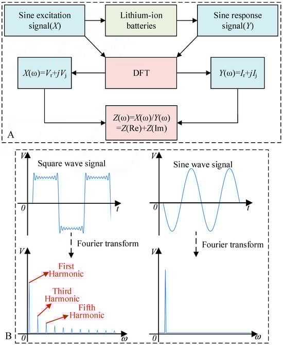 Conventional EIS testing employs sinusoidal excitation signals within a frequency range of 0.1 to 1 kHz [21,22], which widely covers impedance information associated with various polarization processes [23,24]. Low-frequency measurements typically require a longer time. Traditional methods can measure down to 0.1 Hz without such extended duration, and existing instruments offer various methods to respond to signals below 0.1 Hz [25]. In conventional time-domain EIS testing, multiple cycles of a single-frequency sinusoidal signal scan are conducted to ensure accuracy, coupled with the use of Discrete Fourier Transform (DFT) for data processing. The schematic diagram of conventional EIS testing is illustrated in Figure 1A.