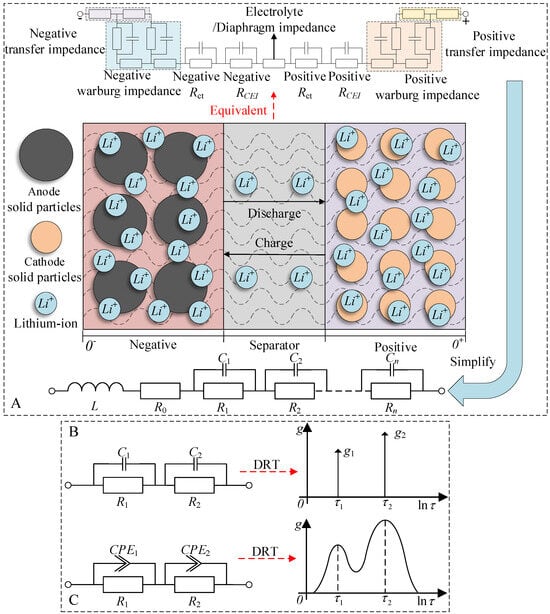 From Figure 2A, it is evident that LIBs constitute a relatively intricate capacitive electrochemical system. Its electrode reaction process is a composite procedure encompassing a series of steps, including material transport and charge transfer [29]. This can be equivalently represented through electronic devices, with the primary and most significant components being the series and parallel combination of resistance and capacitance. For the DRT method, the electrochemical system is regarded as an ohmic resistor R0 (where inductors can be added) connected in series with multiple polarization processes. This method can achieve coverage of any electrochemical system impedance model [30], and a single polarization process can be represented by the parallel connection of capacitors and resistors. To more intuitively reflect the different electrochemical reactions of LIBs, a simplified model shown in Figure 2A can be used to represent it.