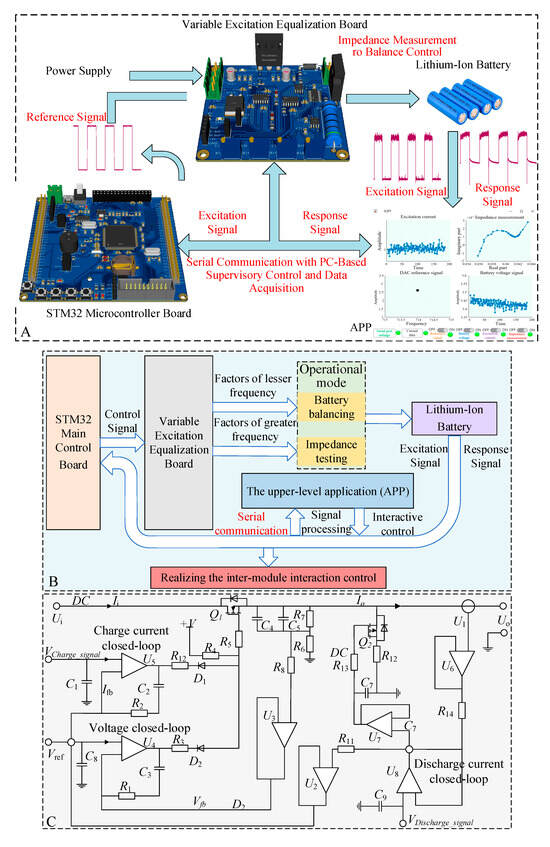 The structure of this testing system comprises four main components: LIBs, the variable excitation balancing board, the STM32 main control board, and the upper-level PC application (APP). The operational process is as follows: First, the STM32 main control board sends instructions to the variable excitation balancing board via control signals, specifying parameters such as the type, amplitude, and frequency of the excitation signal. Simultaneously, the variable excitation balancing board sets the voltage limit based on the type of object being tested (typically around 4.5 V for LIBs). Furthermore, the STM32 main control board uploads data to the upper-level PC application through a serial connection, where data processing and real-time monitoring and display of the testing system occur. In the following sections, we will provide a detailed overview of the system’s various modules and impedance testing experiments.