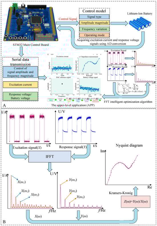 The system software is divided into two parts: the lower-level control implemented on the STM32 microcontroller and the upper-level computer application (APP), as illustrated in Figure 4. Figure 4A depicts the structural diagram of the software components within the testing system. Initially, the STM32 microcontroller controls the excitation power supply’s operating mode, output signal type, amplitude, and frequency. Simultaneously, it collects the excitation current from the battery and the corresponding response voltage, transmitting these signals via a serial interface to the upper-level computer for real-time status display and data processing. Figure 4B represents the structural principles of impedance data processing within the upper-level computer application. Initially, it receives data transmitted through the serial interface and subsequently employs the IFFT to convert the originally time-domain signals into frequency-domain signals. Finally, through mathematical formulas and data point optimization, the ultimate EIS plot is obtained.