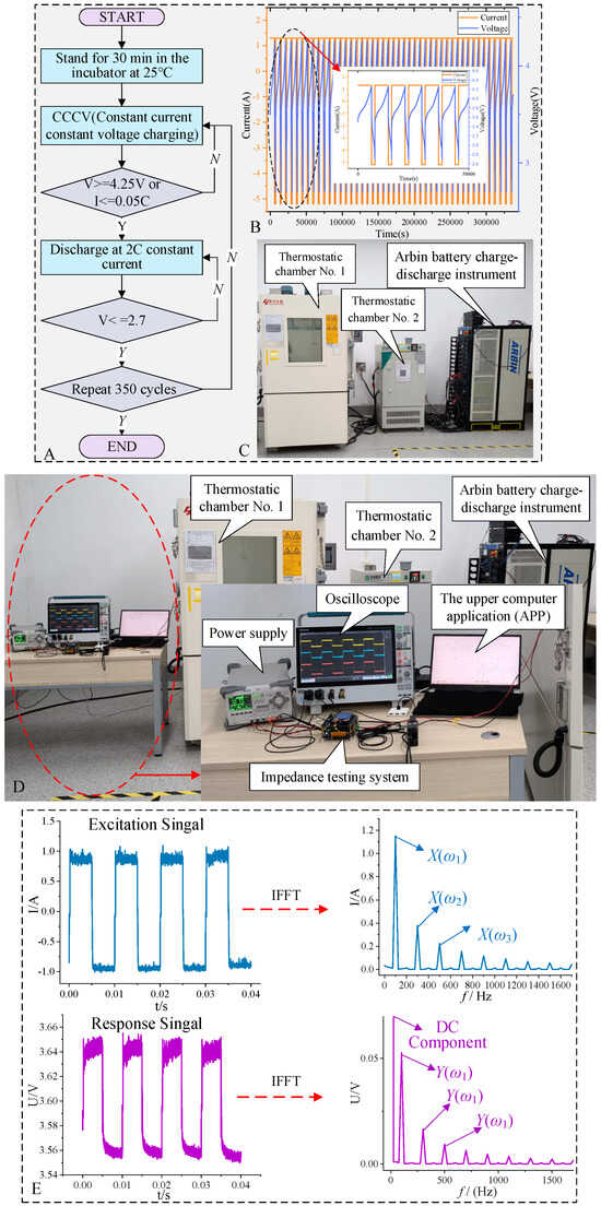 Lithium-ion battery aging and impedance testing experimental graph. (A) Flowchart of the LIBs aging experiment; (B) Voltage and current variation chart of the aged LIBs during the aging test; (C) Experimental graph of actual aging test for LIBs; (D) Experimental graph of actual testing on LIBs; (E) Experimental signal graph of EIS testing at 100 Hz.