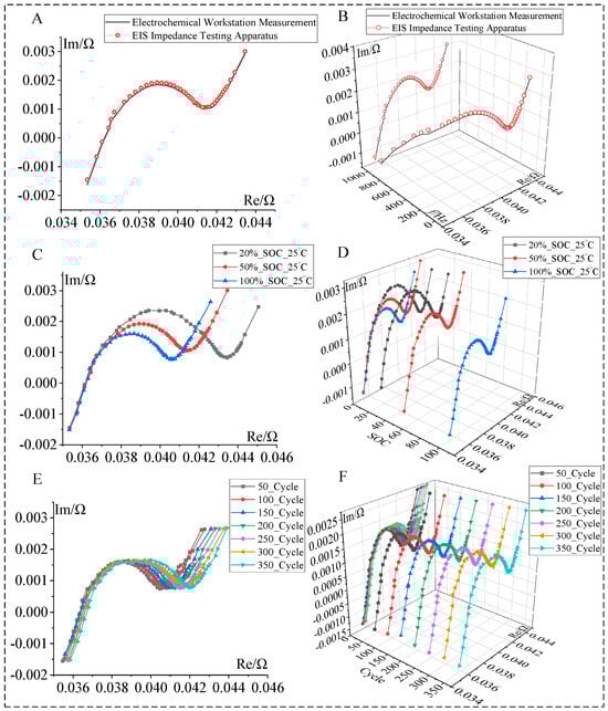 Impedance spectra at different SOC levels and under various cycle numbers. (A,B) Comparison between the EIS testing apparatus and the electrochemical workstation; (C,D) Impedance plots of different cycling numbers; (E,F) Impedance plots of different cycling numbers.