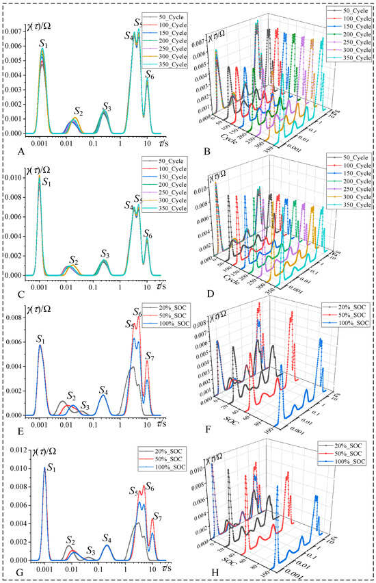 The comparative graphs of impedance data processed through RDRT under different SOC and different cycling numbers are presented in Figure 7, as illustrated. The horizontal axis in the graph represents the time constant τ/s, while the vertical axis represents the impedance magnitude γ(τ)/Ω. During the RDRT processing, the option to include inductance data in the DRT processing can be chosen, and the discretization method utilizes a Gaussian function with a regularization parameter λ set at 0.001. Therefore, Figure 7A,B depicts DRT impedance graphs without inductance for different cycling numbers, while Figure 7C,D shows impedance without inductance. These correspond to six polarization processes associated with different electrochemical reactions. For LIBs at varying cycling numbers, these six electrochemical reactions remain consistent, but the impedance values vary under different electrochemical reactions. Similarly, Figure 7E,F represents DRT impedance graphs without inductance at different SOC levels, while Figure 7G,H shows impedance without inductance. It is worth noting that S3 is present only at low SOC levels and not S7. In summary, the impedance values corresponding to S2, S5, S6, and S7 are significantly affected by SOC, whereas the impedance values for S1, S3, and S4 are less influenced by SOC.